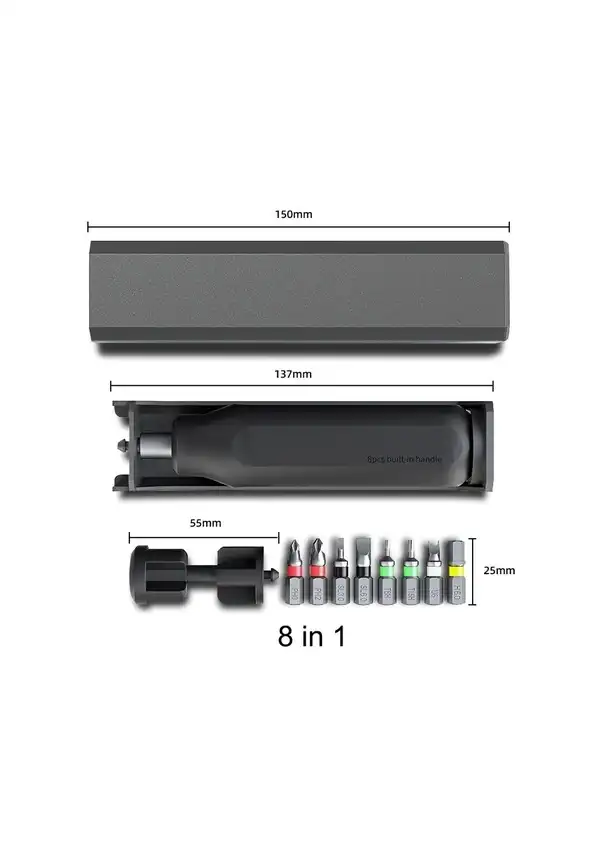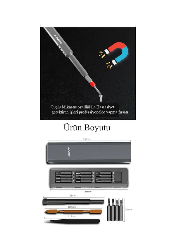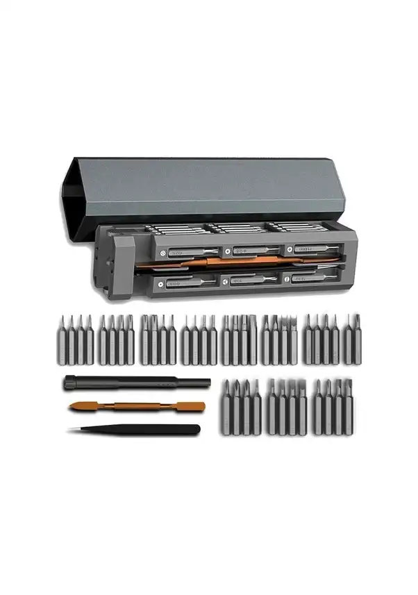 • Phillips, Torx, Flat, Hex, Pentalobe, Tri-wing gibi çok sayıda uç tipi — telefon, laptop, konsol, PC, elektronik cihazlar için uyumlu