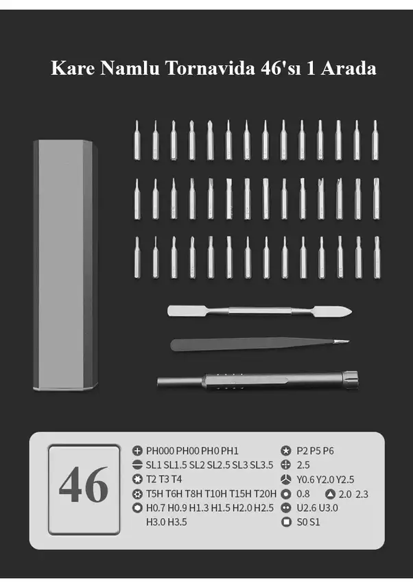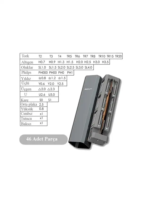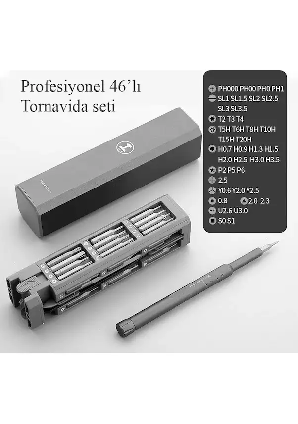 HPY Aktüel 46-in-1 Hassas Manyetik Tornavida Seti — telefon, tablet, laptop, masaüstü bilgisayar ve diğer küçük elektronik cihazların tamiri, bakımı ve montaj-sökme işlemleri için üretilmiş kapsamlı bir tamir kitidir. Kompakt kutusu, ergonomik tornavida sapı ve manyetik hassas uçları sayesinde vidalar düşmeden, güvenli ve pratik bir şekilde çalışabilirsiniz. Geniş uç çeşitliliği ile pek çok cihaz ve vidalama işine uygun yapı sunar
