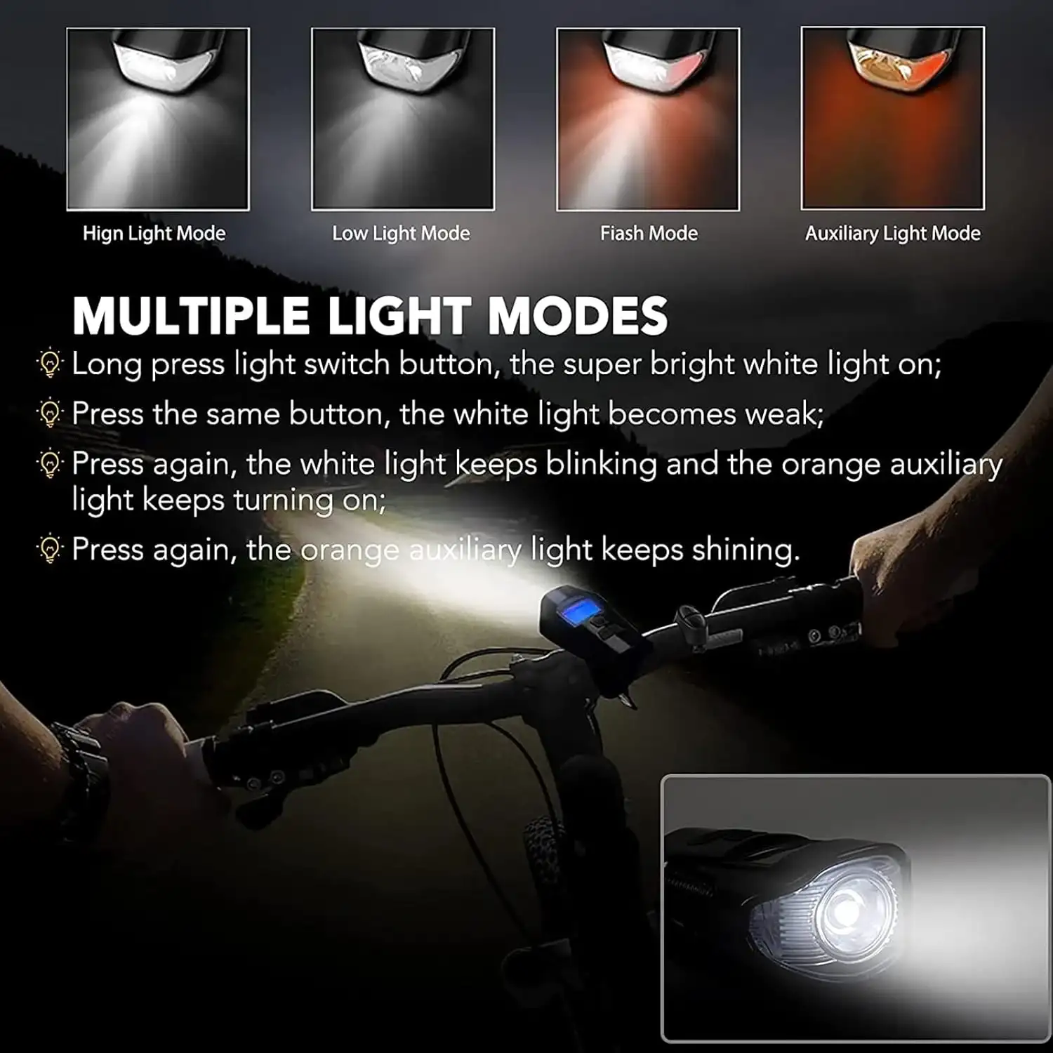4 farklı ışık modu, farklı kullanım senaryolarına uygundur: gece sürüşü için yüksek güç, gündüz uyarısı için strobe, pil tasarrufu için düşük mod gibi. Korna ise trafikte fark edilmenizi sağlar.